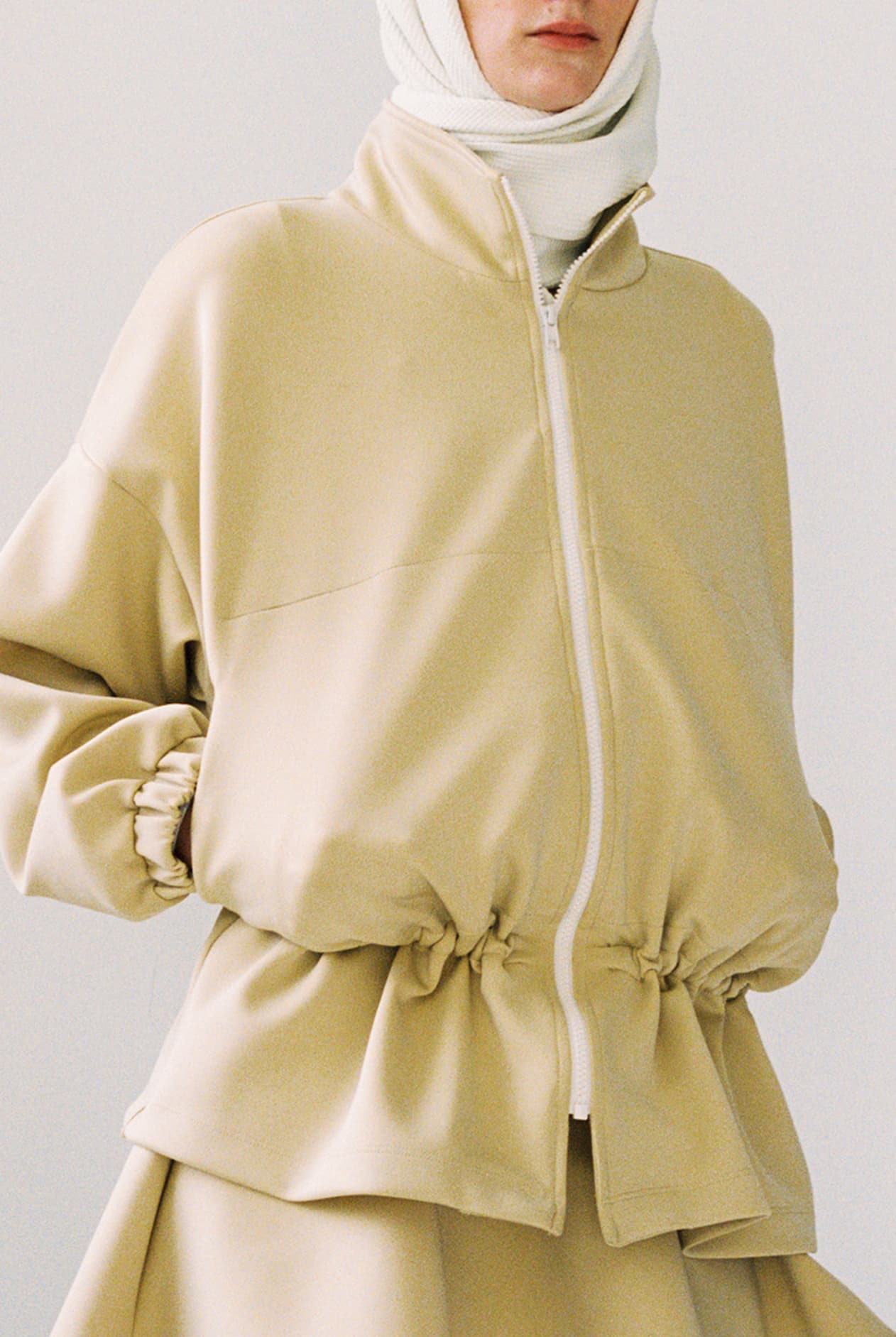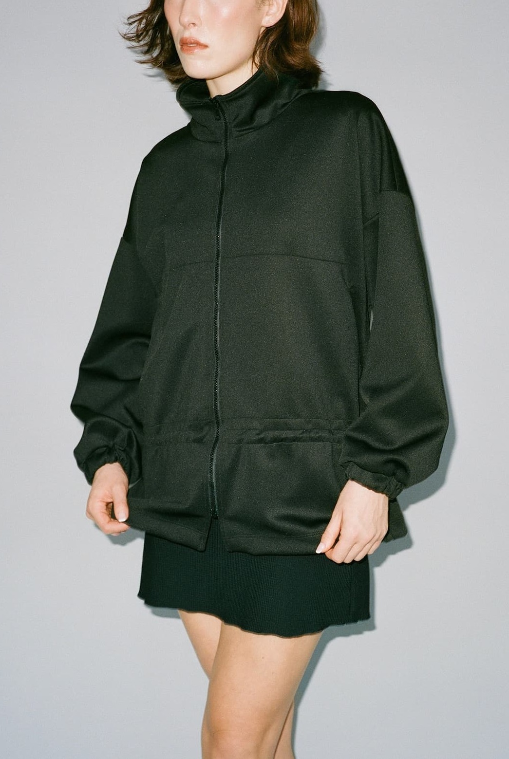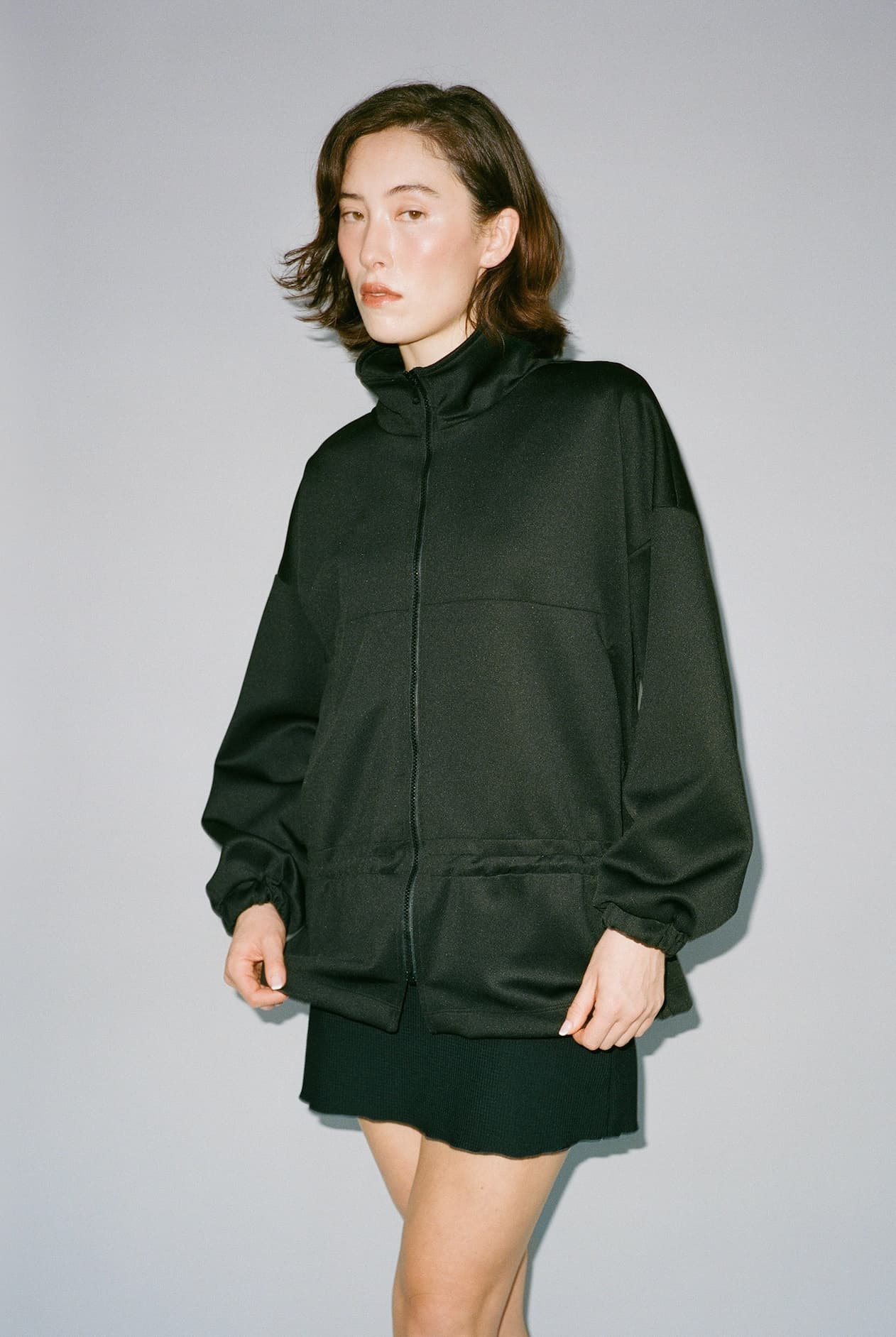 A luxe, lustrous neoprene gives the structured silhouette new fluidity, a piece you can easily dress up or down.