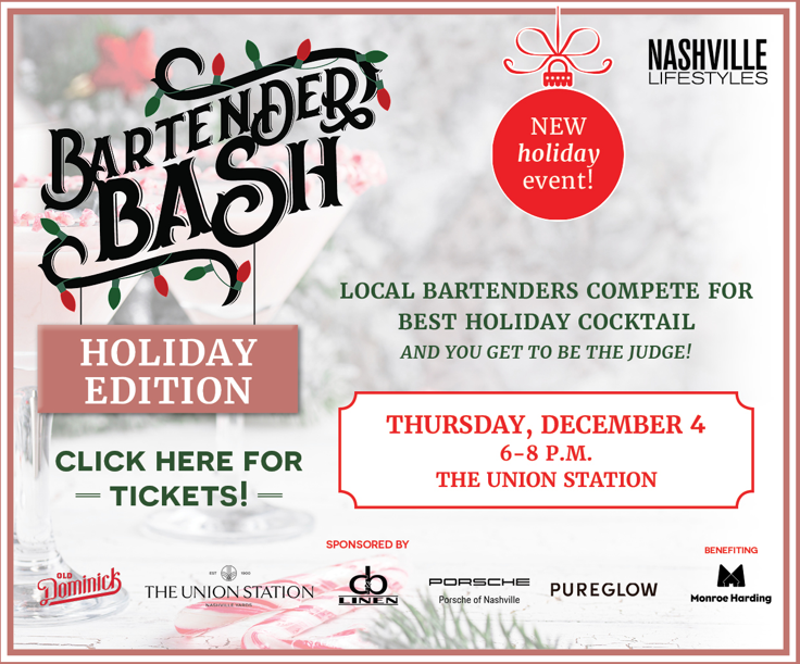 Join us Thursday, December 4 from 6–8PM at Union Station Nashville Yards, where Nashville’s top bartenders battle for the title of Best Holiday Cocktail.