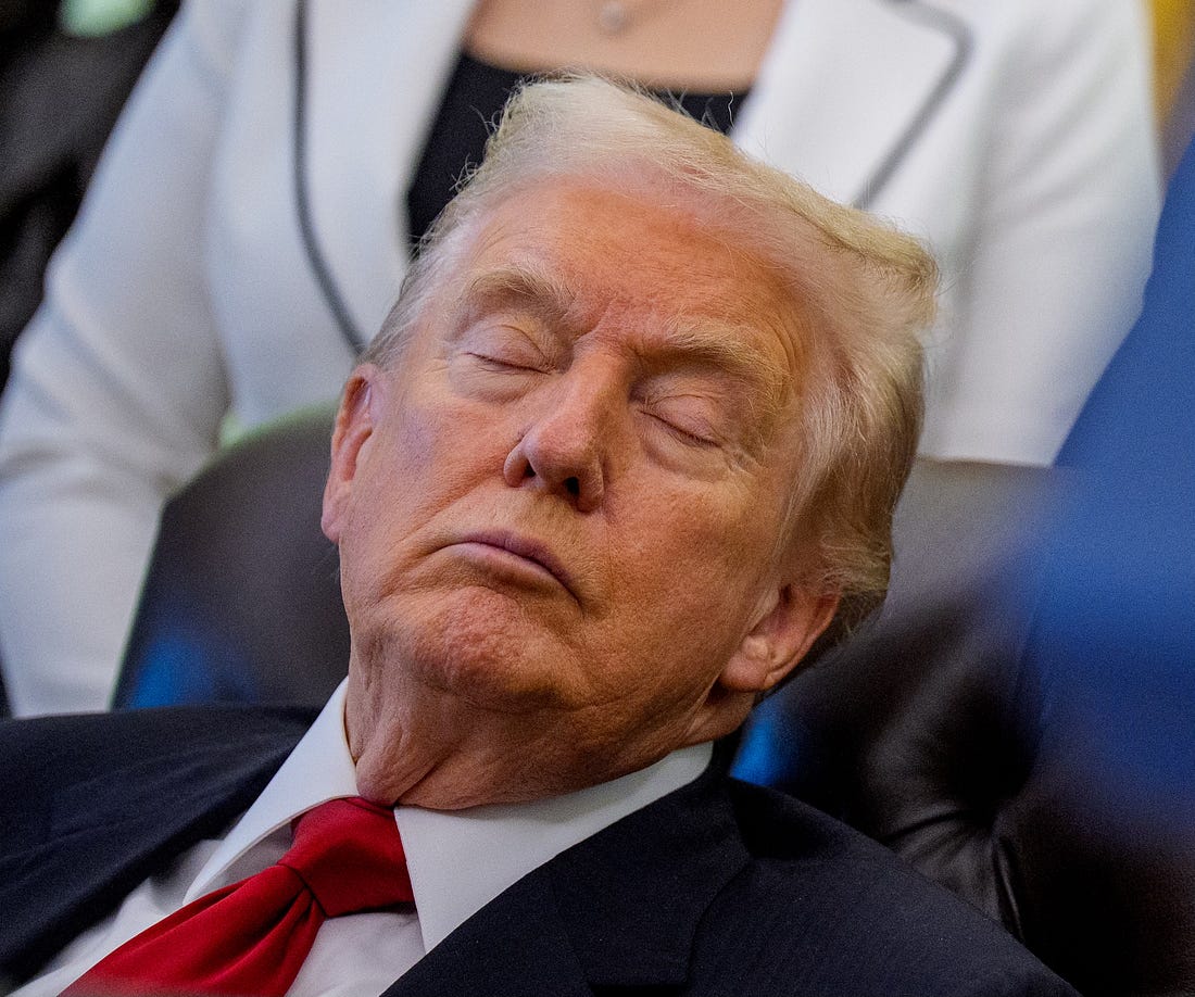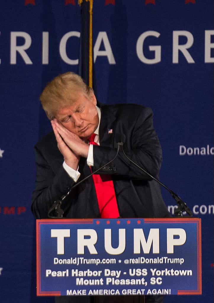 It’s unfair that Trump gets to sleep through his presidency and we don’t.Recent photos of Trump napping on the job have gone viral. But his snoozing isn’t news.Don Snoreleone has a long history of catching some z’s during work hours, as these photos reveal.December 7, 2015: At a rally in South Carolina, Trump mocks his Republican rival Jeb Bush for being “low energy.” Considering Trump’s habit of drowsing off during the day, psychiatrists might say he’s projecting. Is he really imitating Jeb here, or taking a quick catnap himself? January 20, 2017: Right after his apocalyptic inaugural address, Nap-oleon grabs forty winks at an Inauguration Day luncheon. Apparently, it’s exhausting scaring the shit out of America and the world. Meanwhile, it’s dawning on the visibly stricken Melania that she’s yoked to this nightmarish man-baby for another four years. February 7, 2017: Three weeks into his new gig, Trump hits the ground snoozing. During a meeting at the White House, the crushing tedium of being President of the United States makes him crave some shut-eye. Maybe it’ll be easier keeping his eyes open when he gets to do something interesting—like go on a foreign trip? July 13, 2017: No such luck. Any hope that he might appear sentient during a meeting with French President Emmanuel Macron vanishes when his Gallic counterpart’s remarks send him straight to the Land of Nod. February 8, 2018: Trump attends the National Prayer Breakfast and is yet again visited by his old friend the Sandman. Or could it be that he’s actually praying? If so, someone needs to tell him that prayer doesn’t require putting your hand to your forehead like a carnival psychic. April 15, 2024: Trump nods off at the first day of his hush-money trial in Manhattan. Remarkably, he was able to determine that the proceedings were rigged despite being unconscious for most of them. This post was sponsored by MyPillow, the official pillow of Christian nationalism. |