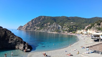 Located midway between Pisa and Genoa, Cinque Terre is easy to get to. Thanks to the efficient Cinque Terre Express, one of the many Trenitalia train routes, you can access it from several Italian cities. The most likely launch spot is a small town called La Spezia, just a 10-minute train ride from the first Cinque Terre village. We stayed in La Spezia and spent two days exploring Cinque Terre. The Best Beach in Cinque Terre Riomaggiore is the first village, and since many like it so well, the 10-minute train ride, initially jammed to the rafters, emptied quickly at this stop. We decided to go to the last (and largest) village, Monterosso, so we could judge the distances between each of the stops, and, glad we did! Along that 20-minute ride we could see glimpses of the Ligurian Sea, which is a section of the Mediterranean, and went through several tunnels. The town is built for tourism, so walkways are everywhere, and the one which parallels the beach is an easy stroll. We found out afterwards that the sandy beach here was the only one along the route; what few beaches there are in the other villages, are mostly rock and pebble. There were several people taking advantage of that sand, and several more enjoying the still-warm October water. |