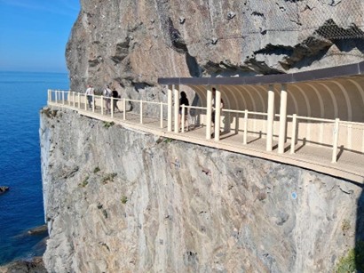 There are those who hike, and those who don't, either because they are not able to, or it's just not their thing. For that, Riomaggiore has a solution. It's called Via dell'Amore, or Street of Love, and it's a paved path, partially covered, that takes you about 3,000 feet along the cliff face. It starts right at the train station and costs about $13, with a discount for seniors. And it's worth every bit of it. The path is easy to walk on, pretty straight all the way; plus, it offers views along the waterfront that you could not see anywhere else in the entire five villages. The walkway was wiped out in a landslide, and closed for 12 years. It just reopened in 2024. It's pleasant, beautiful, and a host of other superlatives, and should not be missed. |
