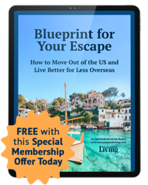 | That's what we can show you how to do. On a budget from $2,000-$3,800 a month (all-in—housing and extras included), you could live comfortably in lots of safe, warm, friendly spots abroad. In fact, in some communities, it can be done for less. We've packed everything you need into a meaty resource called Blueprint for Your Escape: How to Move Out of the US and Live Better for Less Overseas and until midnight tonight, you can claim a free copy with this special membership offer. |