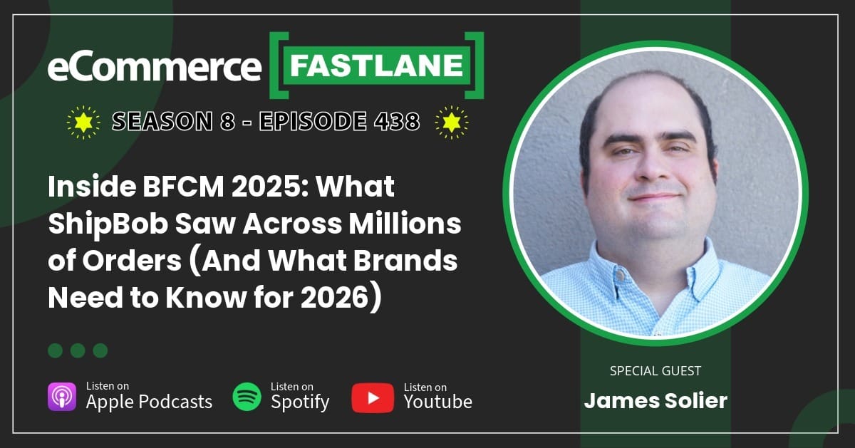 | | | đ§ New Podcast Episode! đ§ | | The Brands That Crushed BFCM Weren't Just Driving Orders—They Built Operations That Scale Into 2026 | Shopify merchants generated over $14 billion during BFCM (up 27% YoY), but the brands still growing in Q1 aren't the ones who had the best Black Friday—they're the ones who nailed what happened after checkout. | I sat down with James Solier, SVP of Central Operations at ShipBob, who just released a massive BFCM postmortem analyzing millions of orders across their 60+ warehouse network. The operational patterns separating winners from plateau brands are now clear—and they're the same moves that set you up to win in 2026: | Inventory timing beats panic buying. Top brands started inbound in September, maintained 22 weeks of cover, and peaked a full week later than last year—proof of cash optimization and 20–40% YoY growth while competitors scrambled.