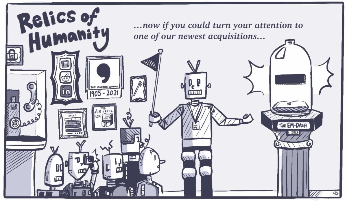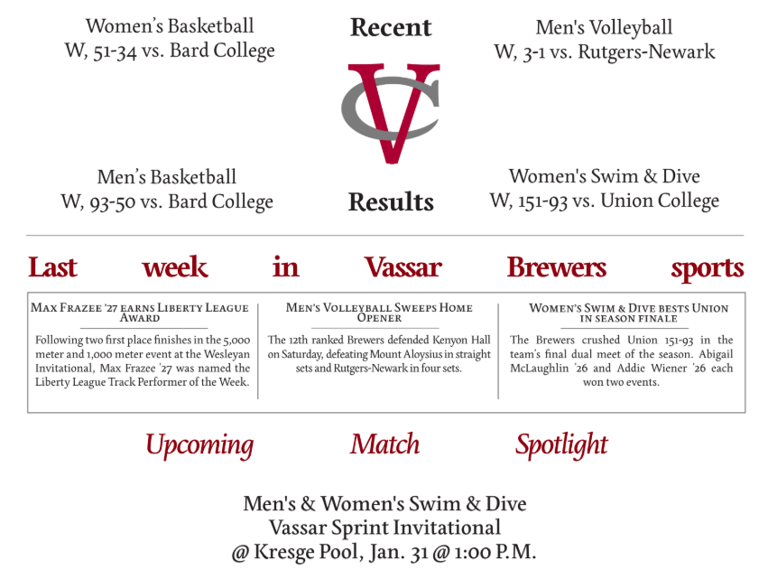 | | EVAN SEKER | Scene 1: An EMPTY MISC OFFICE. EVAN ’28 soliloquizes to an unseen audience. His voice is humorous despite the grave tone he uses. | | Annie McShane/The Miscellany News. | | J. LINCOLN DAUER | The Daily Wire’s flashy, buzzword-filled headline “Woke New York College Allowed Burlesque Troupe to Mock Christianity in Campus Chapel” frames the story it tells as a clear case of institutional disregard for Christian students. Yet a careful reading of the article itself reveals that its central claims rely less on evidence of discrimination and more so on a rhetorical conflation of offense, blasphemy and unequal treatment. Once these categories are disentangled, The Daily Wire’s narrative begins to unravel. | | EMMA DAROSA | Anywhere you go on campus, you can find people doing all kinds of different things: reading their horoscope in the paper, writing a discussion post seven minutes before it is due and maybe kissing each other. What are people doing most of the time, though, more than any of that other stuff? They are on their phones. Yeah, yeah, nobody wants to read another self-adulating article about how screens are ruining our lives, whatever. Phones suck! I hate nothing more than when I am sitting with a group of people, and nobody is talking because everyone is on their phone. I am not immune or anything. I think I have found a really obvious solution to the phone problem on this campus—doing hobbies for attention. | | Annie McShane/The Miscellany News. | | SOREN FISCHER | The law can be an incredibly powerful tool. It has been used to sanctify collective goods, such as universal suffrage, and collective bads, such as the normalization of resource depletion and environmental pollution. It has structured societies, resolved disputes and at times, served as a mechanism for expanding rights and protections. But law is decided by those in power, and power, by its nature, is not synonymous with goodness. | | SYDNEY JONES | I am sick of talking about AI. Maybe you are sick of reading about AI. In spite of the fatigue from the last few years of generative language models’ rapid development, I write this article for the very reason of defending this process: writing. AI has no place, and should not have a place, in the future, taking writing away from the hands of humans, no matter how clumsy and slow we may be. I am frustrated by AI’s claim over the em dash, Oxford comma—although I cannot include one for AP Style Guide reasons, please imagine an Oxford comma here—and generally catchy, but ultimately disingenuously, “nuanced” sentence structure. Seriously—give me back my em dash. | | Sydney Jones/The Miscellany News. | | JACOB CIFUENTES | The past few years have been challenging for the social atmospheres of colleges and universities. The Boycott, Divestment and Sanctions (BDS) movement—pro-Palestine advocates calling for institutions to abstain from financially supporting Israel—and Diversity, Equity, and Inclusion (DEI) efforts have been under attack from the Trump administration. Orders from the President attacking higher education have included the withholding of federal funding, the gutting of DEI, the elimination of student visas and even deportations of international students and legal residents. It is certainly a scary time to work at or attend a college, and yet some aim to turn the temperature up a few notches higher. | | HENRY FRANCE | For most, the Vassar winter break is a long and leisurely hiatus. But for many winter season student-athletes, the break is just a brief pause. The men’s and women’s basketball teams, men’s volleyball team, men’s and women’s squash and men’s and women’s swimming and diving teams reported back to campus early for practice and competition. Many athletes arrive days after Christmas. After a historic fall season, including four conference champions and six national championship tournament qualifiers, winter and spring teams are teed up for lofty expectations. | | CASEY MCMENAMIN | Last year, I wrote my first article for The Miscellany News, reflecting on my lifelong experience as a Chicago Bears fan. The Bears had just squeaked out the ugliest of wins in Week 1 of the 2024season, secured against a mediocre Tennessee Titans team led by Will Levis. Caleb Williams did not look like the Heisman Trophy-winning No. 1 overall pick quarterback that was promised to deliver the Bears Faithful their first Super Bowl in 40 years. Despite Williams winning the first game of his young career, there was little hope for Bears fans. As my friend Gavin Akoto ’25 and I watched the game from our couch, there was a hint of déjà vu in the air. As experienced fans of the Blue and Orange, we had seen this story many times. We had lived through the screen passes of Matt Nagy and Mitch Trubisky, we had cheered as Justin Fields scrambled for a 60-yard touchdown, only to fumble the ball or miss three open receivers on the next series, and finally, we had suffered through the torment of Matt “Dweeberflus” Eberflus. We knew that pain and loss were coming. We could never have guessed that a year and some change later, our beloved Chicago Bears would be one score away from heading to the National Football Conference (NFC) Championship game. | | Image courtesy of Anika Mueller-Hickler ’26. | | | | |
