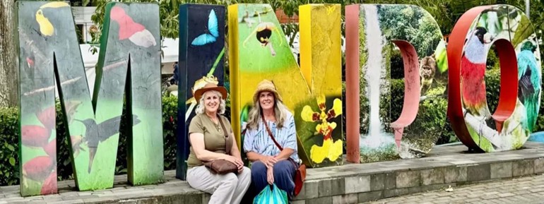 Leena and her sister, Mona, at the vibrant Mindo sign in Ecuador. © Vijay Raju |