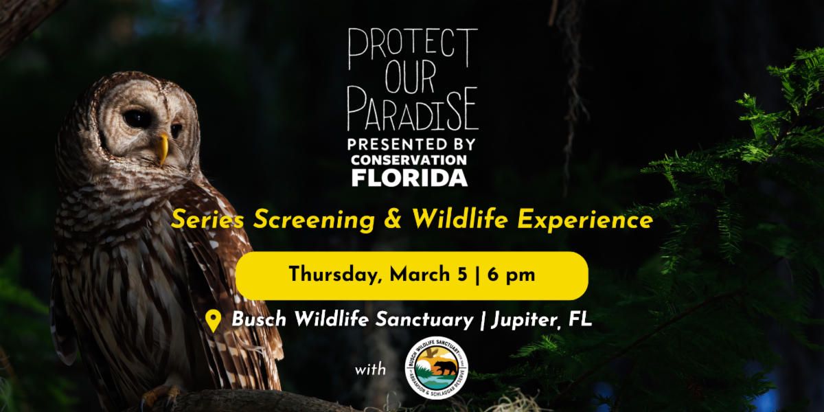 Join Conservation Florida and Busch Wildlife Sanctuary for a special screening of Protect Our Paradise, an Emmy-award winning original docu-series, and a conversation with Conservation Florida and Busch Wildlife Sanctuary about land conservation and wildlife rehabilitation. While you are there, meet some furry (and feathered!) friends while enjoying refreshments and connecting with fellow nature lovers.